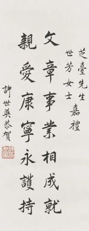许世英、王芃生早在民国二十五年即与高罗佩相识于日本,并鼎力襄助其汉学研究。许世英奉上书法立轴“文章事业相成就,亲爱康宁永护持”相贺(图8),题款曰:“芝台先生、世芳女士嘉礼,许世英恭贺”;王芃生则以书法对联“华国芳荷被怀琰,高山流水鼓鸣琴”相赠(图9),巧妙地嵌入高罗佩、水世芳姓名中的一字及高氏最钟爱的古琴曲,题款曰:“芝台先生、世芳女士花烛之喜,王芃生、钟贤英偕祝。”限于篇幅,不再一一列举。