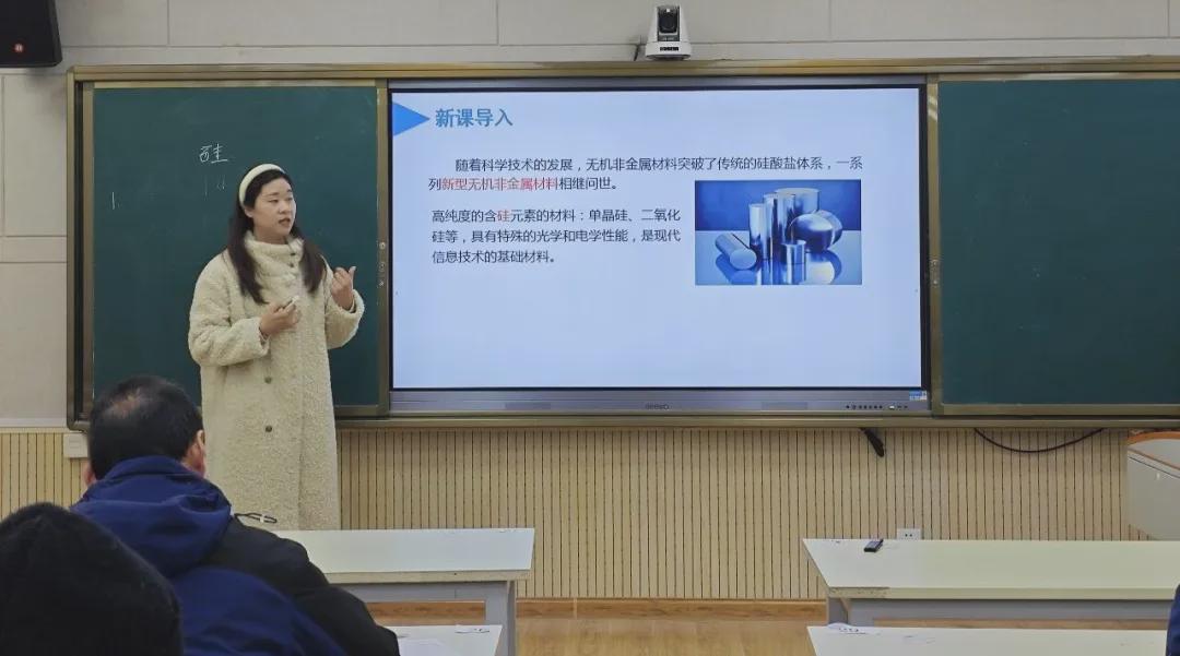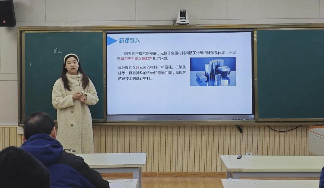 陈老师以新授课形式讲解无机非金属材料—硅,通过图片直观呈现工业制硅及高纯硅的制备过程,清晰展现了从沙滩到用户的“华丽转身”,进而聚焦硅的物理性质、化学性质及用途等核心知识点,指导学生根据反应条件和原料尝试书写相关化学方程式,让课堂兼具知识性与针对性。