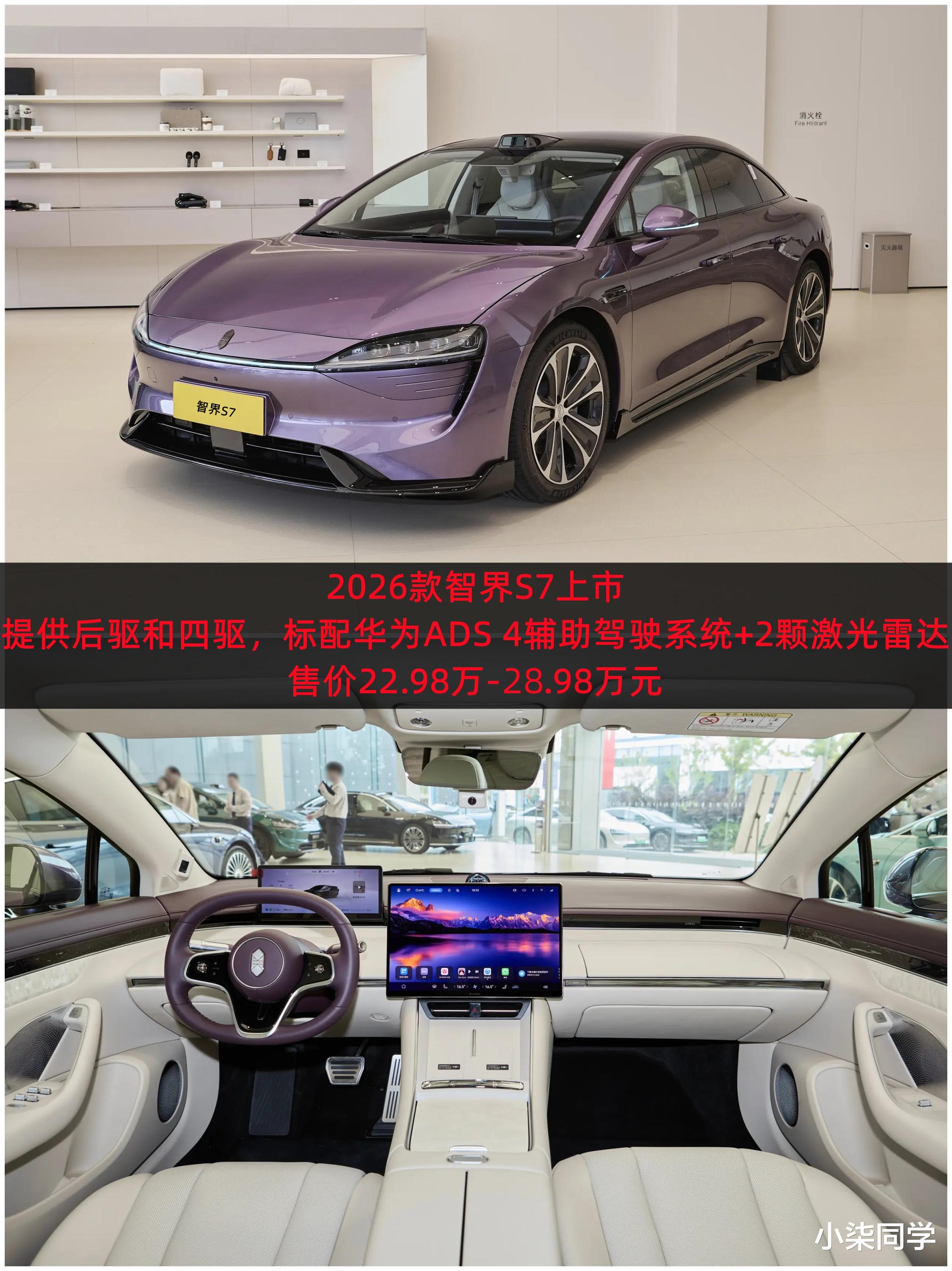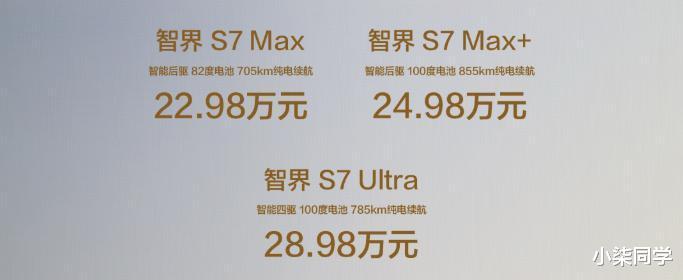 2026款智界S7提供3款配置车型,分别为:后驱Max、后驱Max+、四驱Ultra,售价分别为22.98万元、24.98万元、28.98万元。