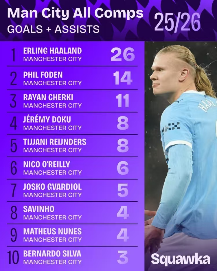 数据显示,哈兰德本赛季已经参与26球,福登14球,谢尔基11球。