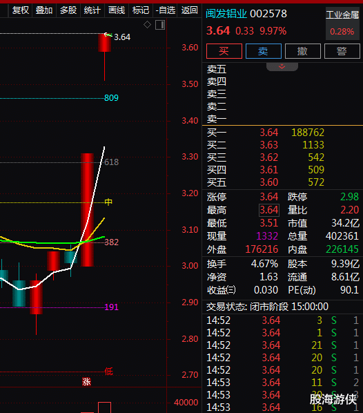 从技术面上来看,闽发铝业(002578)该股在板块的带动下,2天2板!2个交易日股价上涨了21%!短期看均线和MACD形成金叉行情后,有继续上扬的动力,主力资金净流入4182.2万元。该股入选龙虎榜,净买入额为6187万元。