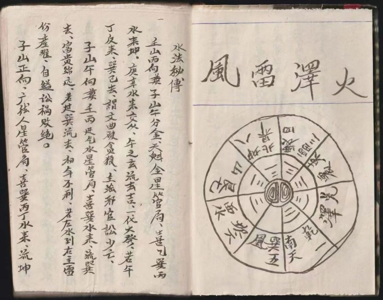毛笔书写的字迹古朴遒劲,多幅手绘水法图 —— 九宫盘、九星水势、二十四山向、消水方位,线条清晰,标注精准,比后世翻印本更能还原古法真意。无水印、无断页、无涂改,传统线装的形制,保留了清代钞本的原始风貌。