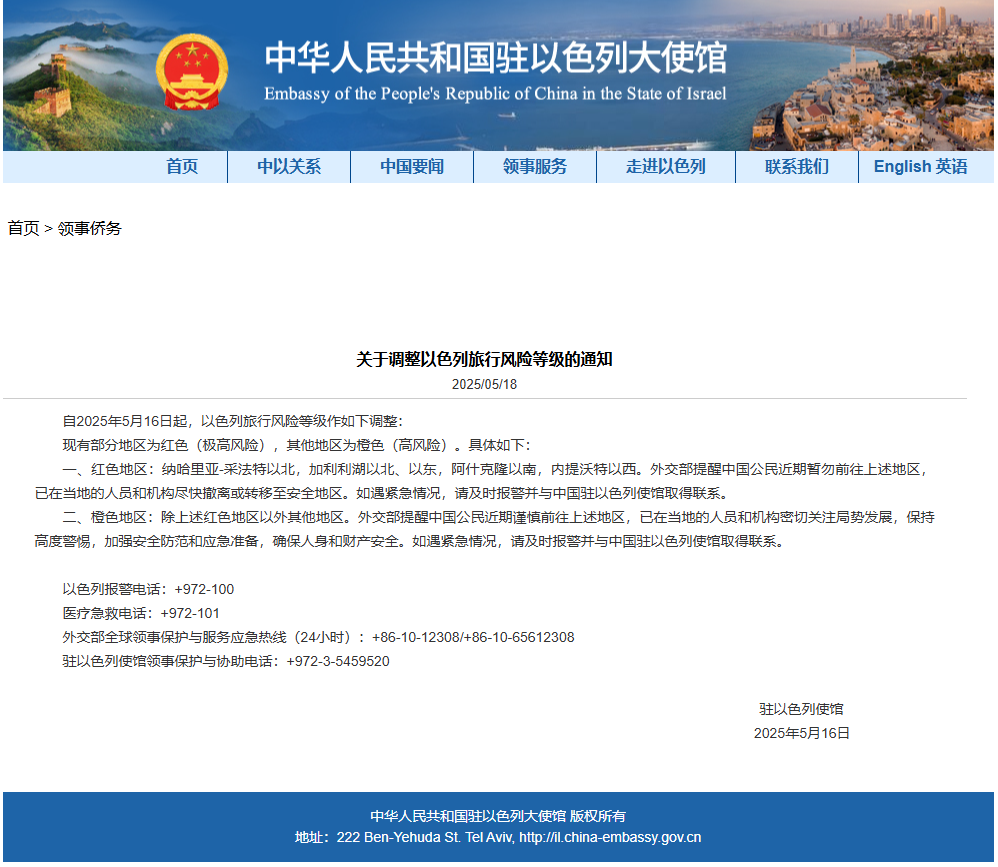 中国使馆将以色列北部(纳哈里亚-采法特以北)和南部(阿什克隆以南)列为红色极高风险区,其他地区为橙色高风险区,并要求公民“速撤”。这一划分直指以军与黎巴嫩真主党、伊朗系武装的交火前线,也是加沙冲突外溢的核心区域。