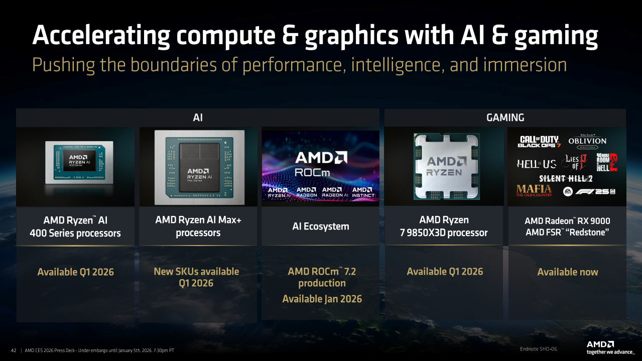 ▲ 每年,AMD 都会给我们 PC 用户带来很多惊喜,今年也一样,AMD 正式发布了9850X3D 这款 8 核心 16 线程市售 Top 级的游戏 CPU,针对Radeon RX 9000 系列的AMD FSR 4 迭代进化,以及笔记本端的Ryzen AI 400 系列的全新登场,搭配上全新的NPU 进化以及ROCm 平台的进一步优化,这些将会给用户带来全方位的游戏、创作领域与 AI 领域的提升,助力用户获得更佳的游戏体验,更为出色的民用与专业级 AI 体验提升!