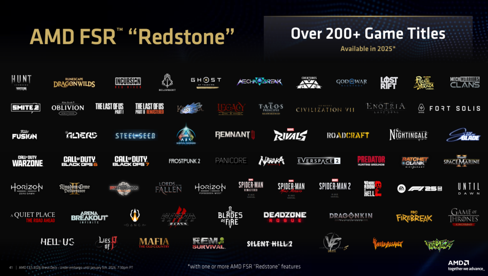 ▲ AMD FSR 家族已经针对200 多款游戏实现了技术支持,让用户可以在这些游戏里获得更为流畅的游戏体验,未来将会有更多的游戏支持FSR Redstone 技术。