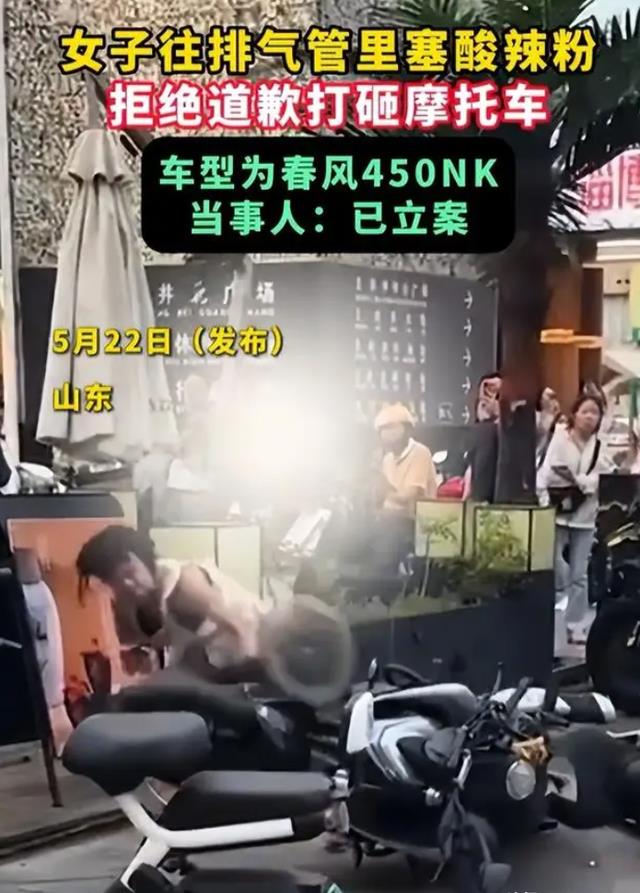 5月21日,淄博王府井的街头,一名女子赤脚砸车的视频在全网疯狂传播,她穿着超短裙,抡起铁柱砸向一辆价值3万元的摩托车,边砸边骂凭啥说我丑,甚至试图用打火机点燃车辆!