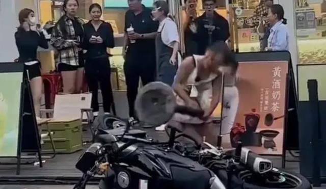 围观群众拍下的视频里,她一边骂脏话一边抡铁锤,甚至试图点燃摩托车!