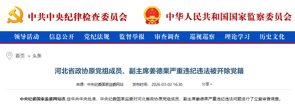 观其宦迹,自公社报道员至副部大员,凡四十二载,遍历文秘、研究、县市党政、纪检、政府、政协诸要职,主政邢台、石家庄、唐山等重镇,可谓“封疆大吏”。然其既登高位,渐忘初心。乙巳年(2025)九月二十日,中央纪委国家监委通报:河北省政协原党组成员、副主席姜德果涉嫌严重违纪违法,接受审查调查。丙午年(2026)三月,审查终结。