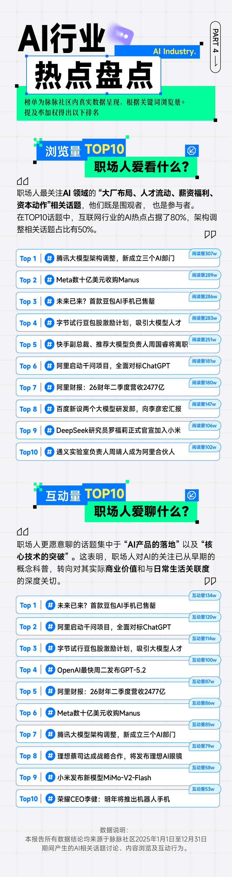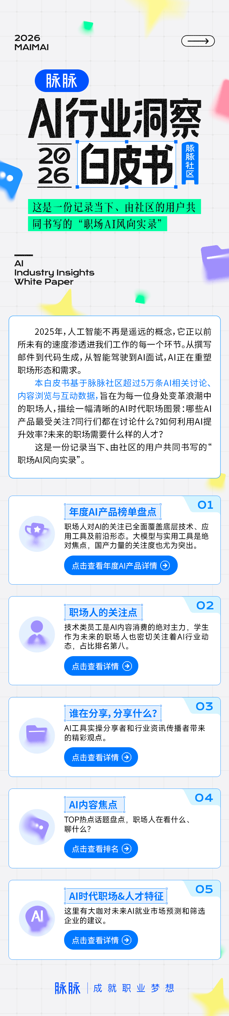 基于脉脉社区超过5万条AI相关讨论、内容浏览与互动数据,脉脉整理了一份AI行业洞察2026白皮书,旨在为每一位身处变革浪潮中的职场人,描绘一幅清晰的AI时代职场图景:哪些AI产品最受关注?同行们都在讨论什么?如何利用AI提升效率?未来的职场需要什么样的人才?这是一份记录当下、由社区的用户共同书写的“职场AI风向实录”。