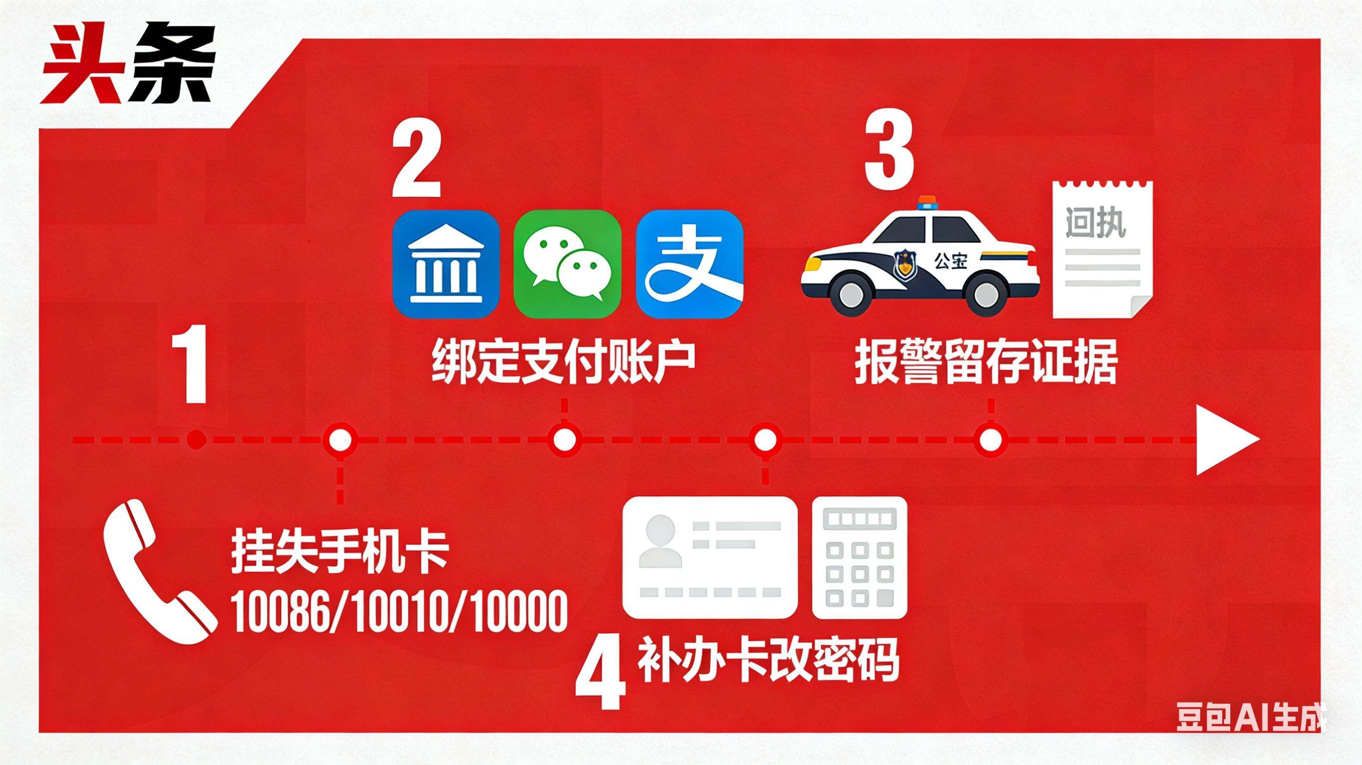 1. 立刻挂失手机卡:拨打运营商客服(移动10086、联通10010、电信10000),说明手机丢失,冻结手机号,阻断验证码获取通道。