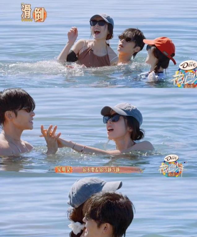 在车上穿着衣服就算了,在水里衣服本来就少,还一直要贴着人家,把侯明昊和一边的金晨都搞得非常尴尬。