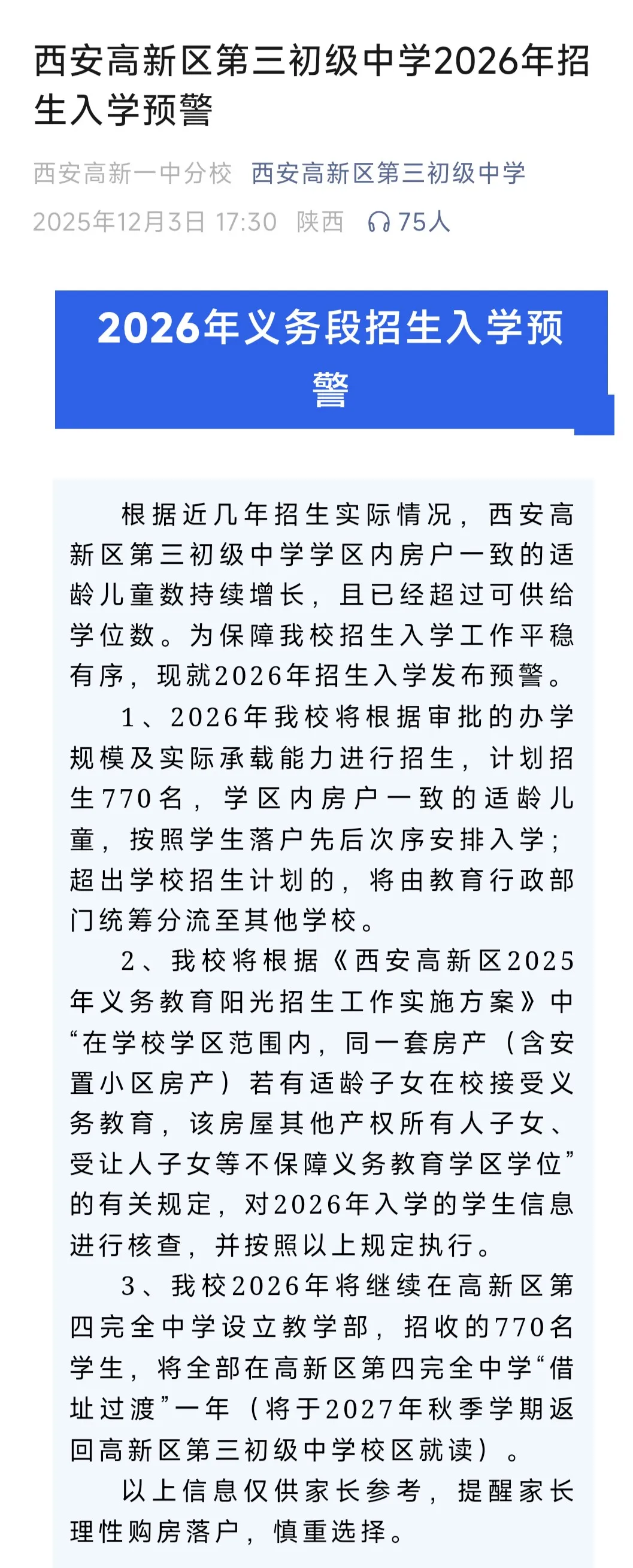 ⬆️动动小手点个关注~⬆️12月3日,西安高新第三初级中学发布2026年招生预警,计划招生名额仅770人,入学资格将严格
