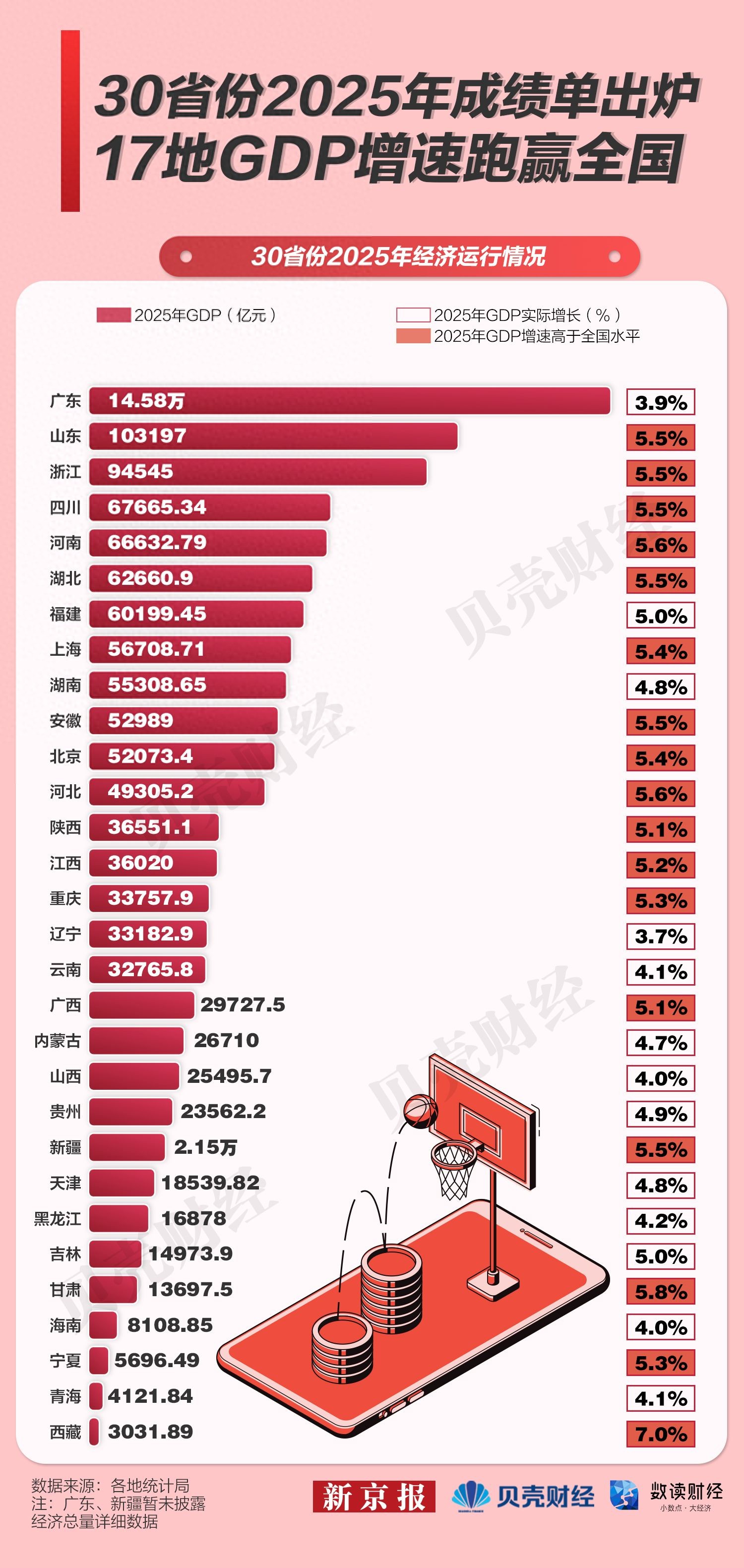 截至目前,全国已有30个省份陆续披露2025年经济运行情况。从已公布数据看,17个省份GDP实际增速超过全国5.0%的增速水平,其中西藏增速达到7.0%。