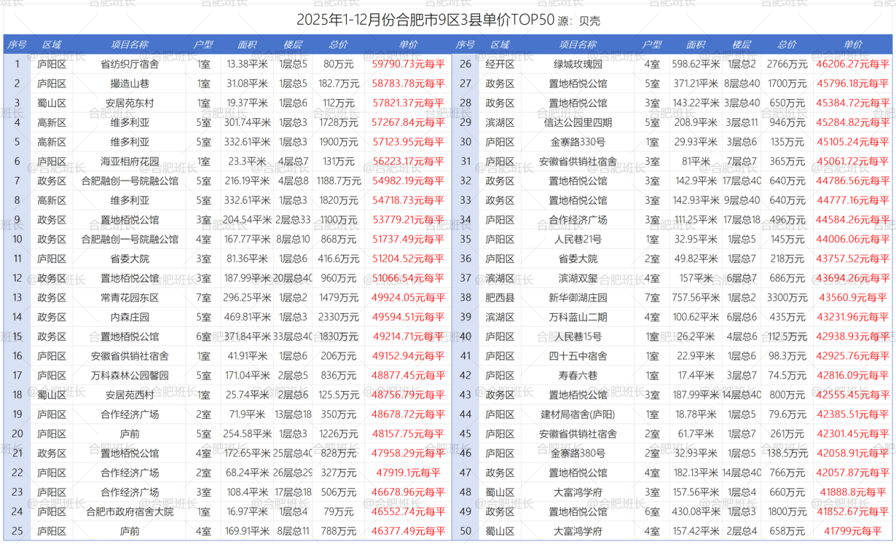 在单价TOP50方面,政务区改善盘和庐阳区小面积学区房为成交主力,TOP50的门槛是4.18万/平米。