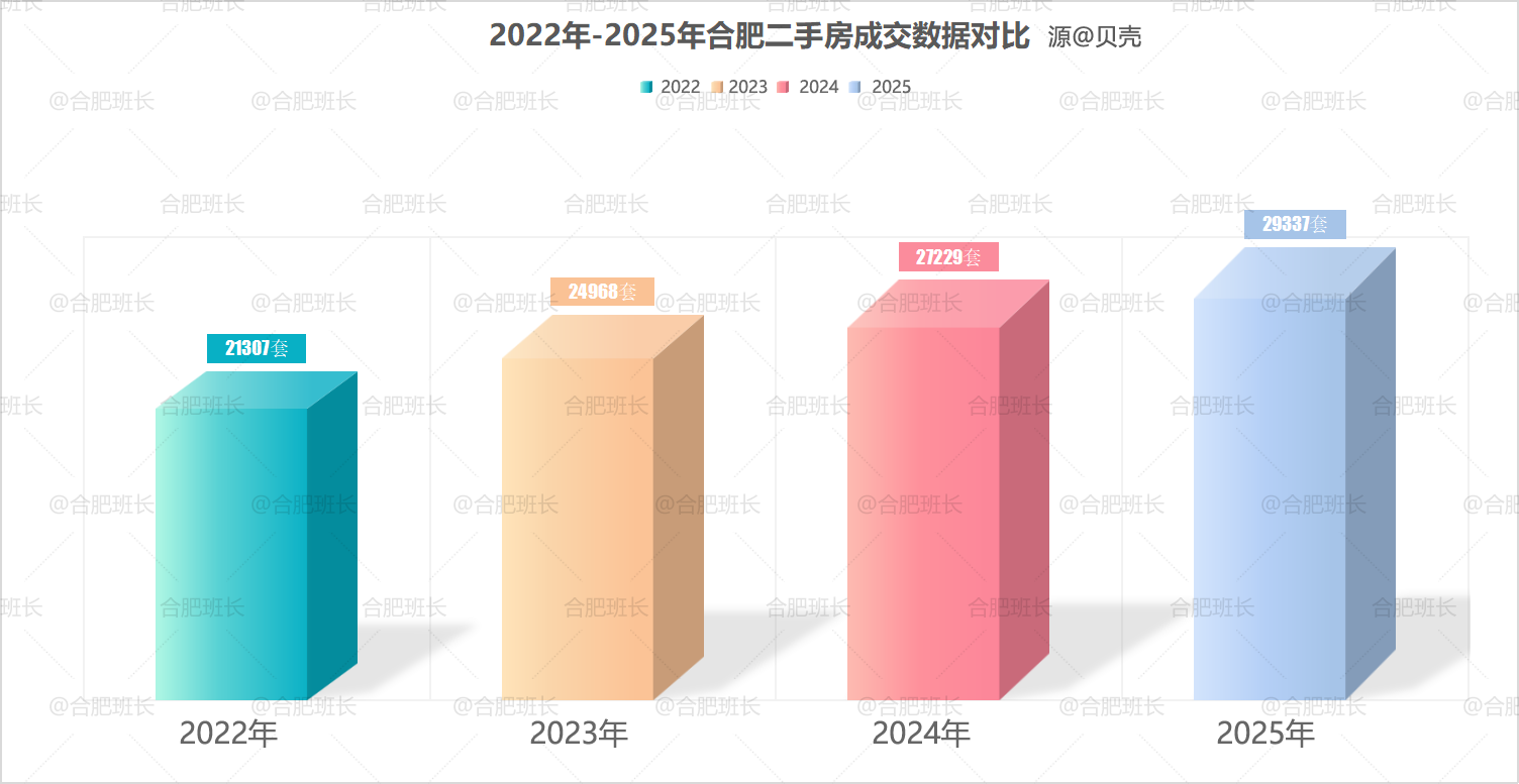 合肥2025年二手房住宅累计成交29337套(仅指贝系成交,包含9区3县,下同),自2022年前,销量已实现3连涨,2025年较2024年上涨约8%。