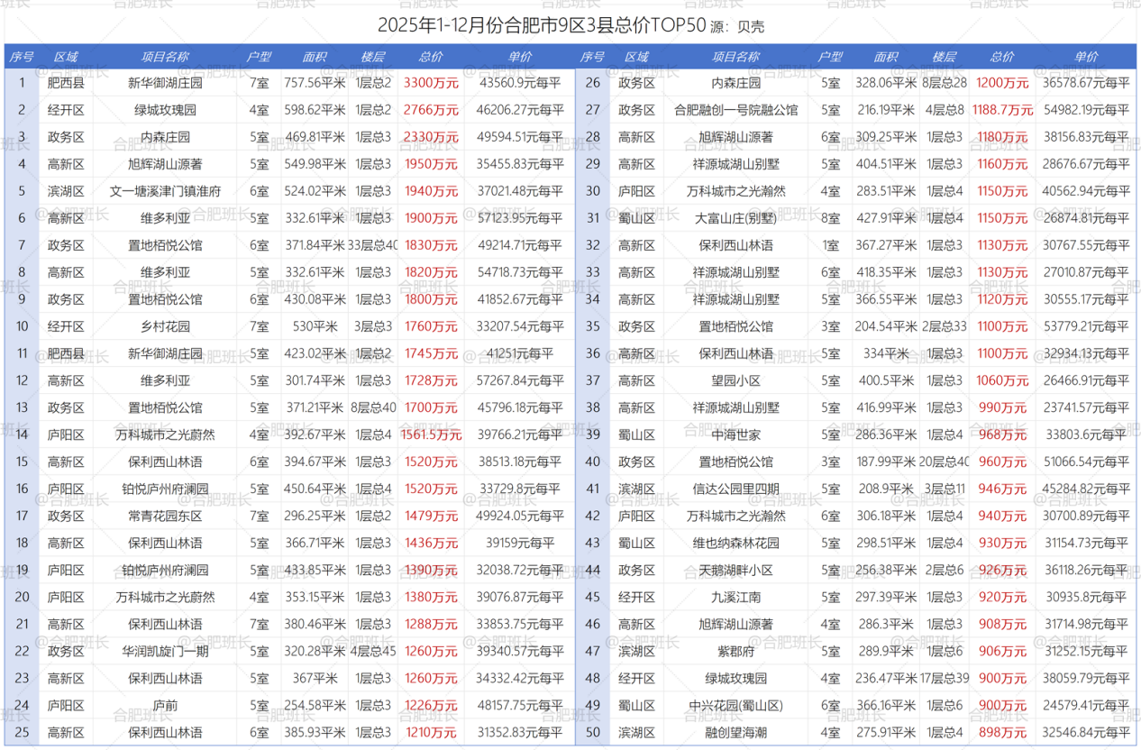 在总价TOP50方面,没想到的是成交总价TOP1来自肥西县——新华御湖庄园成交1套758平别墅,总价高达3300万;总价TOP50的门槛是898万元。