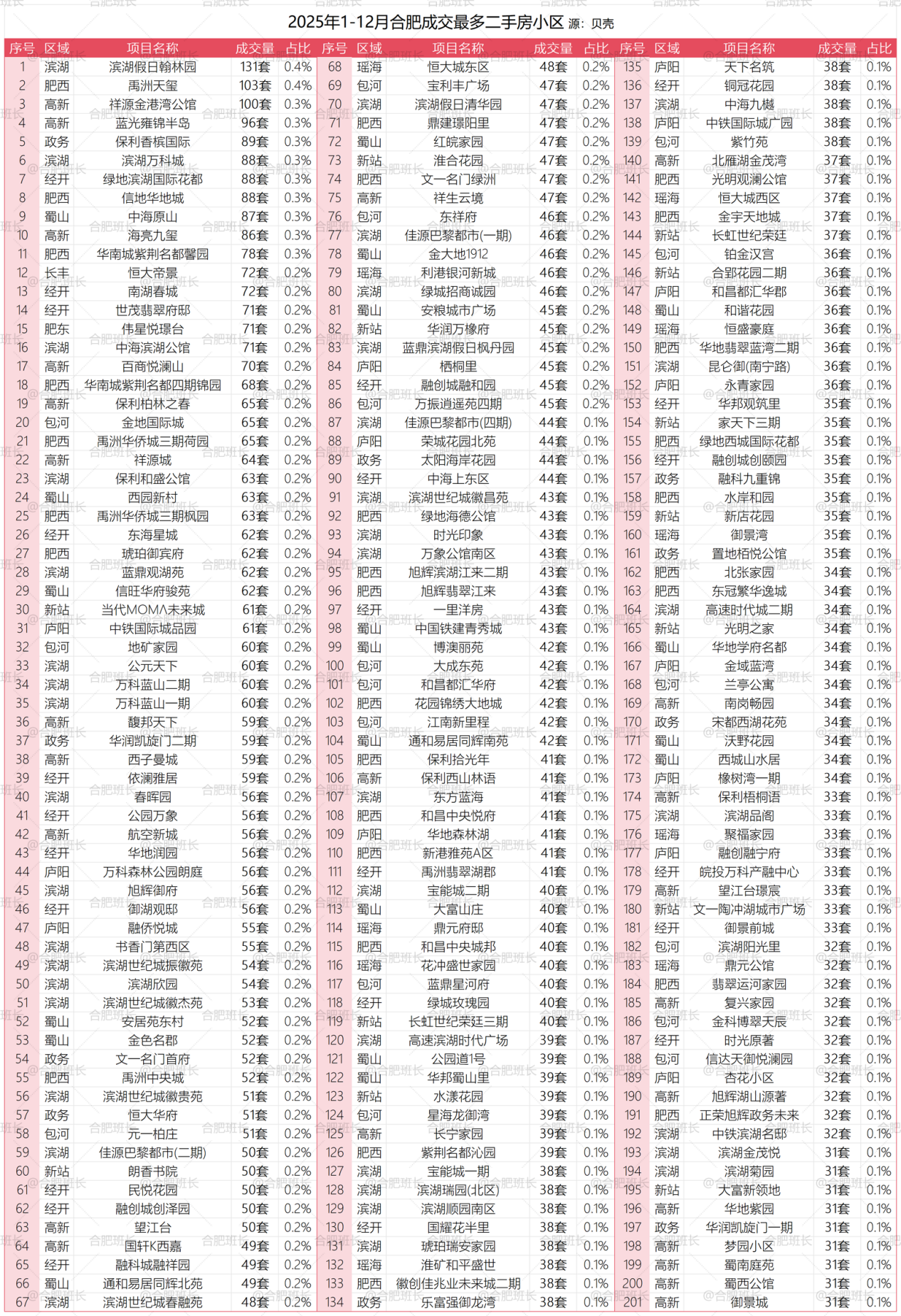 班长统计出了销量最好的前201个小区(按独立园区统计,比如万科森林公园是分13个园区计算),2025年成交量最多的是滨湖区的滨湖假日翰林园,共成交131套房源,肥西的禹洲天玺、高新的祥源金港湾公馆成交量破百。