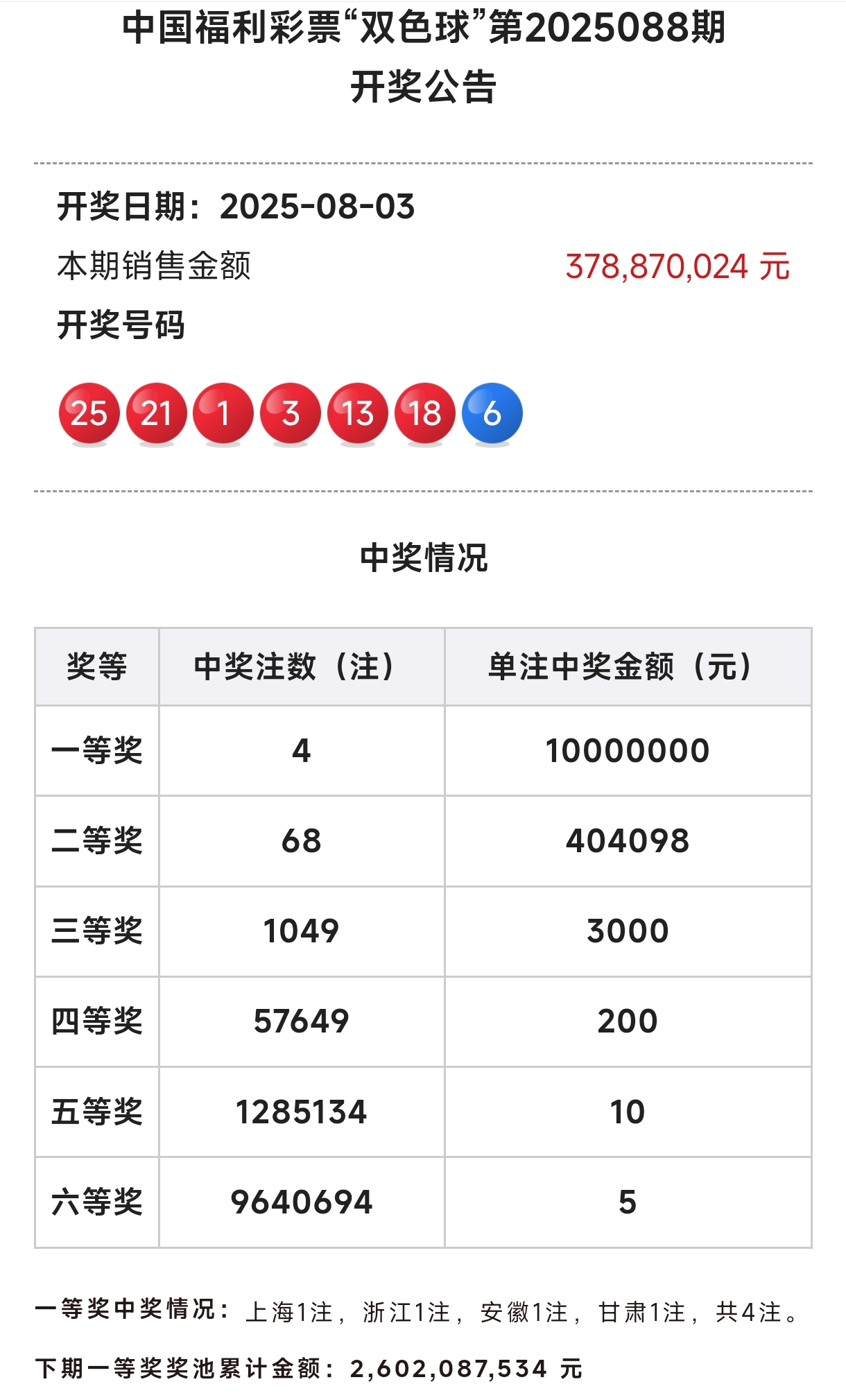 双色球第25088期开奖揭晓:一等奖4注,四地彩友各中1000万元