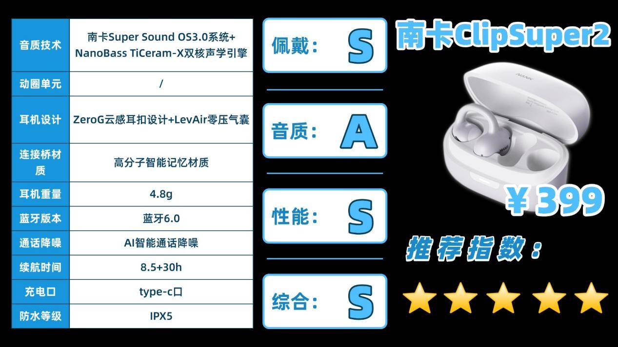 如果你想要一款音质好、戴着舒服、功能又多的开放式耳机,南卡Clip Super2真的挺值得考虑的。南卡本身就在国内耳机行业里算是做技术很硬的品牌,它不仅通过了欧盟CE、美国FDA等一堆权威认证,还在欧美、日本、韩国都挺受欢迎。作为国产耳机里比较能打的品牌,南卡确实做到了从“中国制造”升级到“中国智造”。
