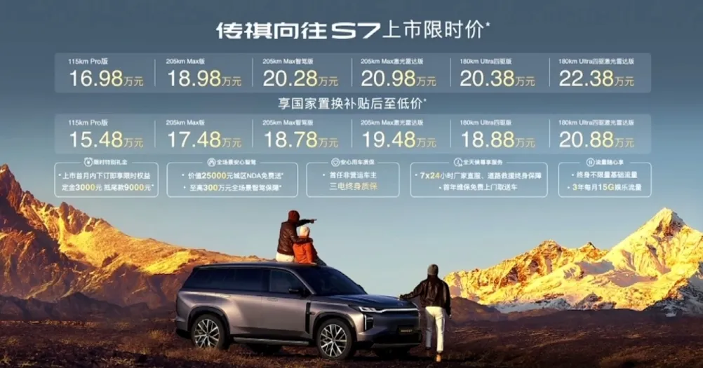 3月30日晚间,广汽传祺旗下中大型SUV车型——传祺向往S7正式上市。新车共推出6款车型,指导价区间为17.58万-22.98万元;上市限时价16.98万-22.38万元,享受国家置换补贴后售价格区间15.48-20.88万元。