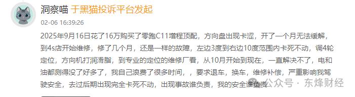 另一位2026款零跑C11增程300激光雷达智尊版车主投诉称:“花了16万购买了零跑C11增程顶配,方向盘出现问题,开了一个月无法缓解,到4s店开始维修,修了几个月,还是一样的故障,左边3度到右边10度范围内卡死不动。调4轮定位,方向机打润滑脂,到专业的定位的维修厂看,从10月开始到现在,一直解决不了!”
