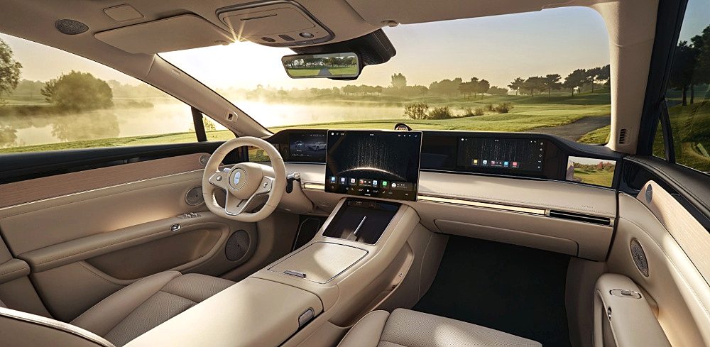 进入车内,享界S9最引人注目的是全面升级的多屏系统,中控主屏尺寸扩大至16.1英寸,并新增了一块12.3英寸的副驾娱乐屏,实现了主副驾独立的娱乐体验。
