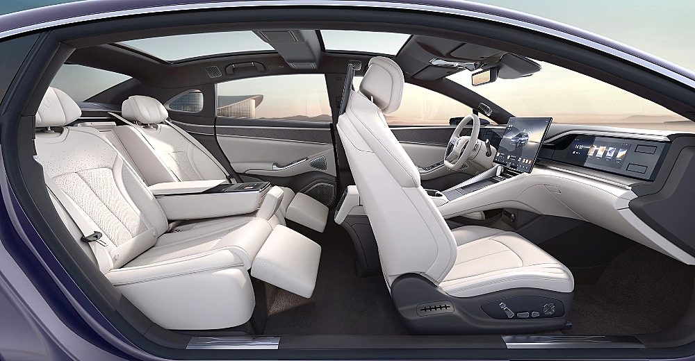 这款车采用了浅黛真木饰板、顶级Nappa真皮以及绒面顶棚,第二排配备了双浮感舒享座椅,支持一键舒躺、十点式按摩、通风加热等多种功能,致力于提供头等舱般的乘坐体验。