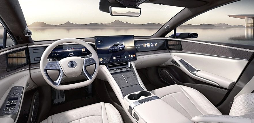 腾势Z9的内饰采用了全新的四辐式多功能方向盘,中控台的核心是一块17.3英寸的悬浮式旋转大屏,显示效果细腻,功能丰富。