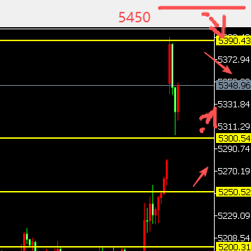 1、黄金冲破5390后,再次快速回落,面临5300,再次快速回升,上看5390的位置。再次上破,新高看向5450的阻力。