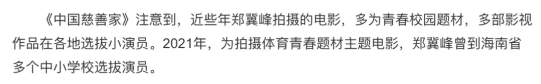 另据媒体调查报道,郑某峰这些年来拍摄了多部青春校园题材的影视作品,2021年时,为了拍摄体育青春题材主题电影,郑某峰曾到海南省多个中小学校选拔演员。