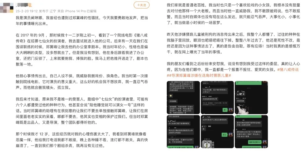就在郑某峰被海口警方刑拘后,今天(2月20日)下午,有曾经参演过《猪八戒传说》电影的女演员发文称,在参演这部电影时,遭到郑某峰的猥亵,当时该演员年仅12岁。