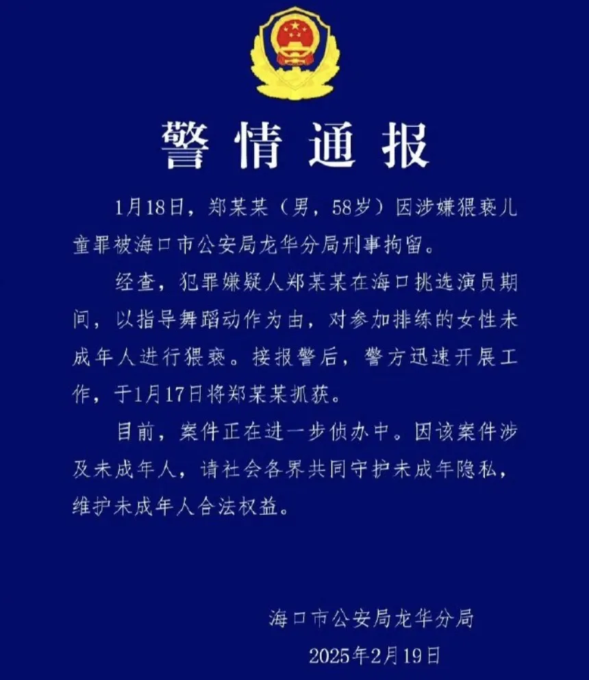 据海口警方的通报,郑某峰已于1月18日被刑事拘留,调查出来的原因是,他在海口挑选演员期间,以指导舞蹈动作为由,对参与彩排的女性未成年人进行猥亵。