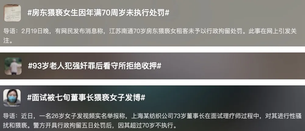 这两天,除了郑某峰猥亵儿童的案件,#房东猥亵女生因年满70周岁未执行处罚#、#93岁老人犯强奸罪后看守所拒绝收押#、#面试被七旬董事长猥亵拘留处罚不执行#等消息,纷纷冲上热搜,引发大众对妇女、儿童权益的关注。
