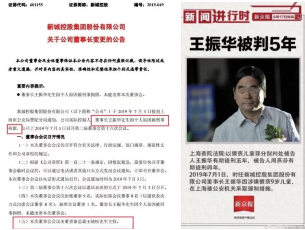 2019年7月3日,时任新城控股董事长王振华被曝猥亵一名9岁幼女,被公安机关采取刑事。新城控股是一家知名的地产上市公司,当时的王振华身价高达240亿。
