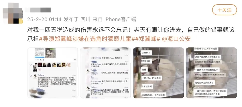 2月20日凌晨1点,该女演员再次在社交媒体平台发文“对我十四五岁造成的伤害,永远不会忘记!老天有眼让你进去,自己做的错事就该承担”。
