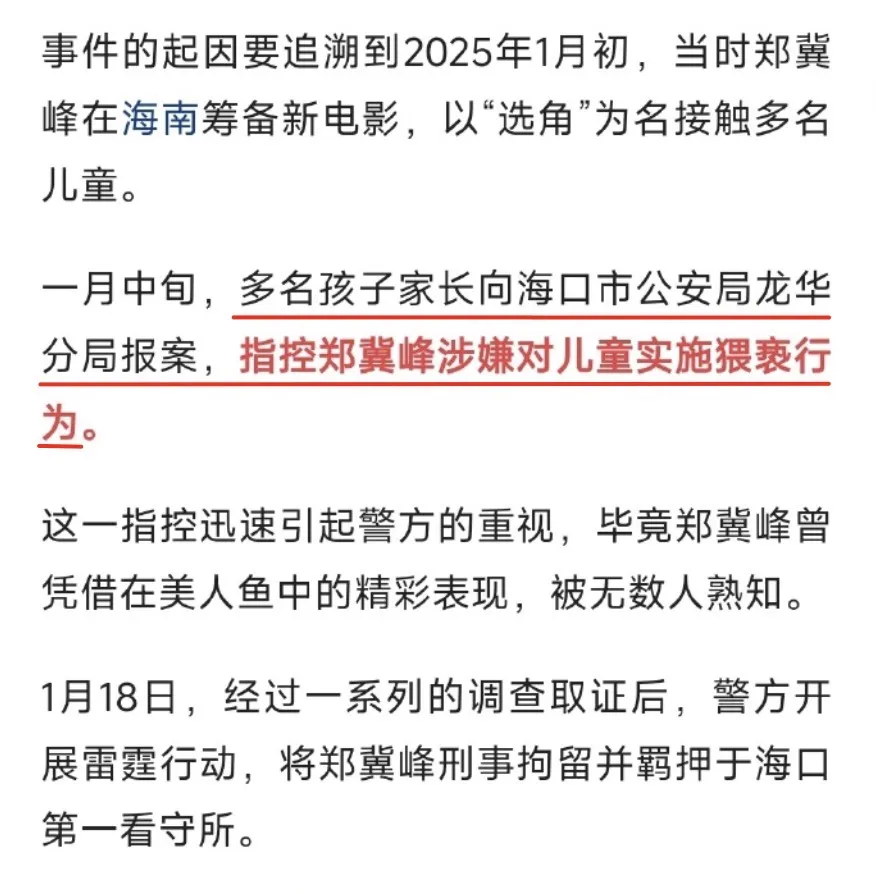 据爆料,此事是2025年1月初,郑某峰在海南筹备新电影,一月中旬时,多位孩子家长向公安局报案,指控他涉嫌对儿童实施猥亵行为。