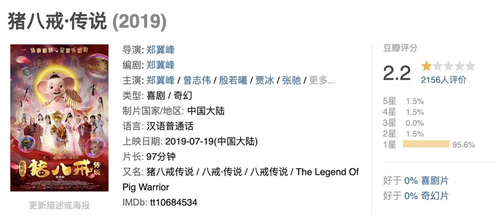 不过,《猪八戒传说》上映后的口碑并不好,该影片的豆瓣评分仅2.2分,有95.6%的用户给出了一星评价。