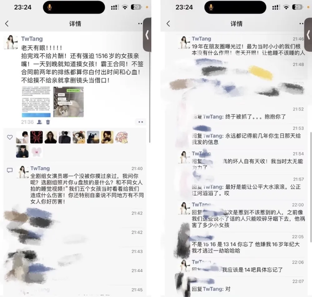 此外,还有另一个女演员在得知郑某被刑拘的消息后,在微信朋友圈中直呼“老天有眼”,她称19年在朋友圈曝光过,但当时小小的她们根本没有什么作用。
