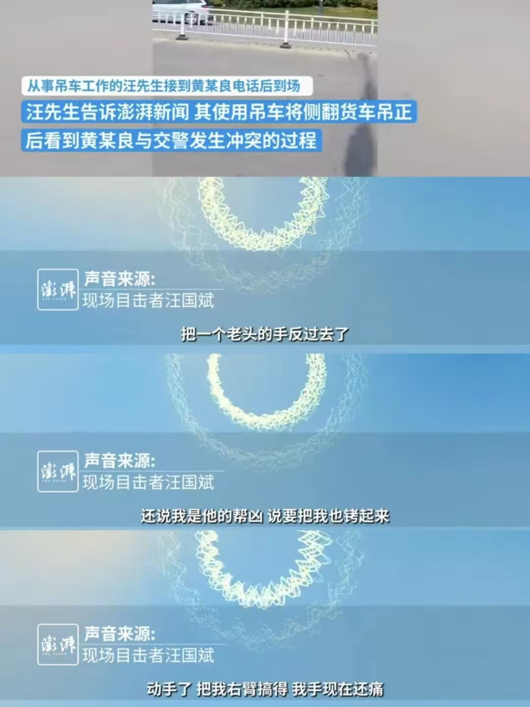 黄某儿子称,父亲自身患有高血压,在交警来到事故现场处理问题时,父亲的朋友就来到现场吊车了,当时父亲想要去车上拿回钱包,资料和发票。