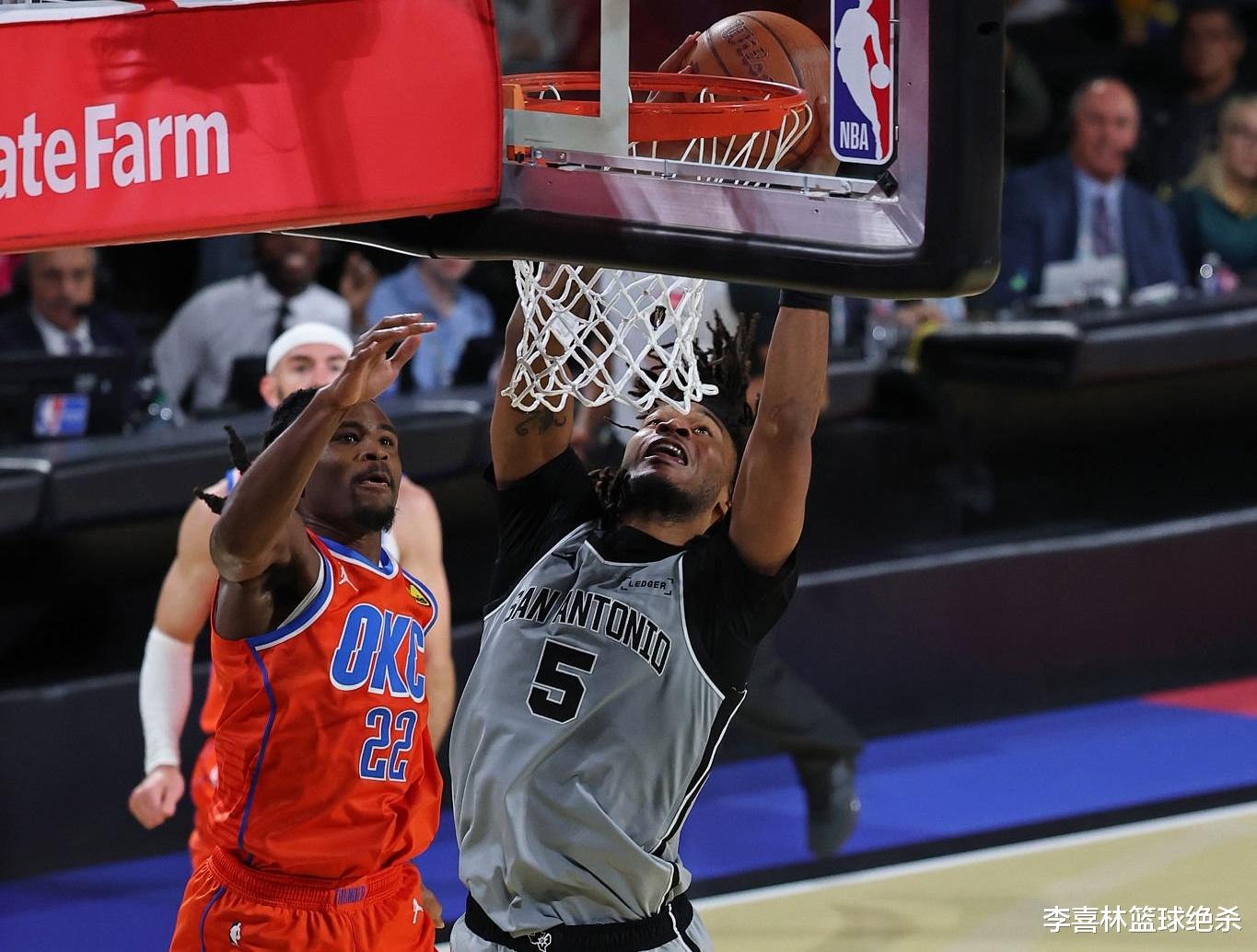 卡斯尔在这时候勇敢地站了出来,他突破抛投得分,接着在瓦塞尔的助攻下扣篮得分,马刺94比93领先1分。卡斯尔在比赛时间还剩4分11秒发底线球助攻文班空接扣篮得分。比赛时间还剩9.8秒,卡斯尔被卡森·华莱士犯规后稳稳罚进两球,帮助马刺继续领先3分。卡斯尔在比赛时间只剩1.5秒的时候果断对杰伦·威廉姆斯犯规,不给他出手三分球的机会,杰威第二罚故意不进,卡鲁索仓促补篮不中。