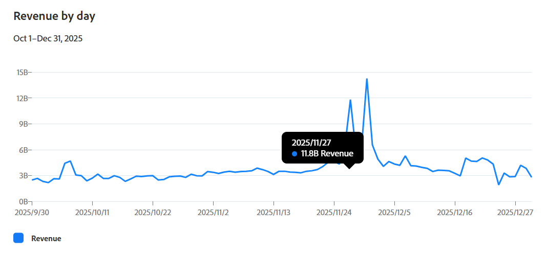 即便是感恩节当天,线上销售额也达到了64亿美元。整个假日季,日均销售额超过40亿美元的天数多达25天,比上一年增加了7天,可见消费热度持续高涨。
