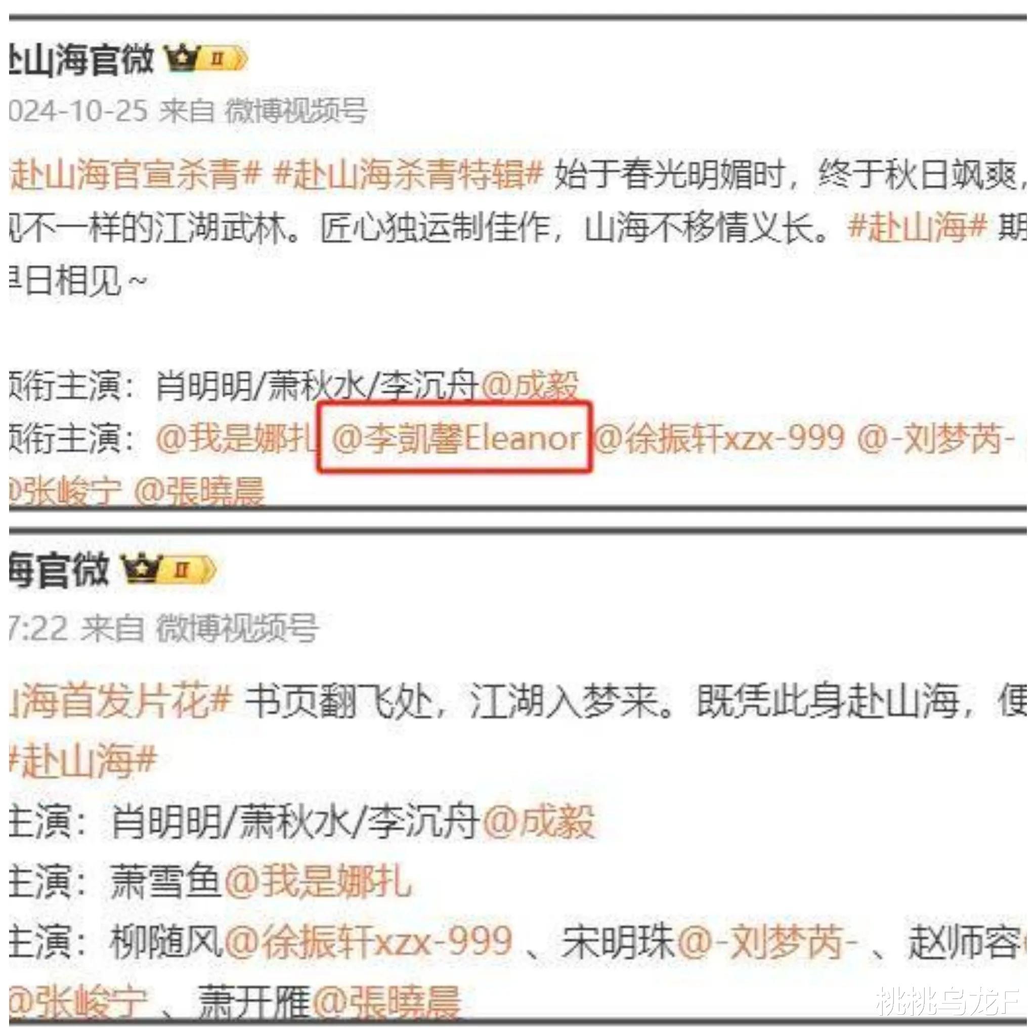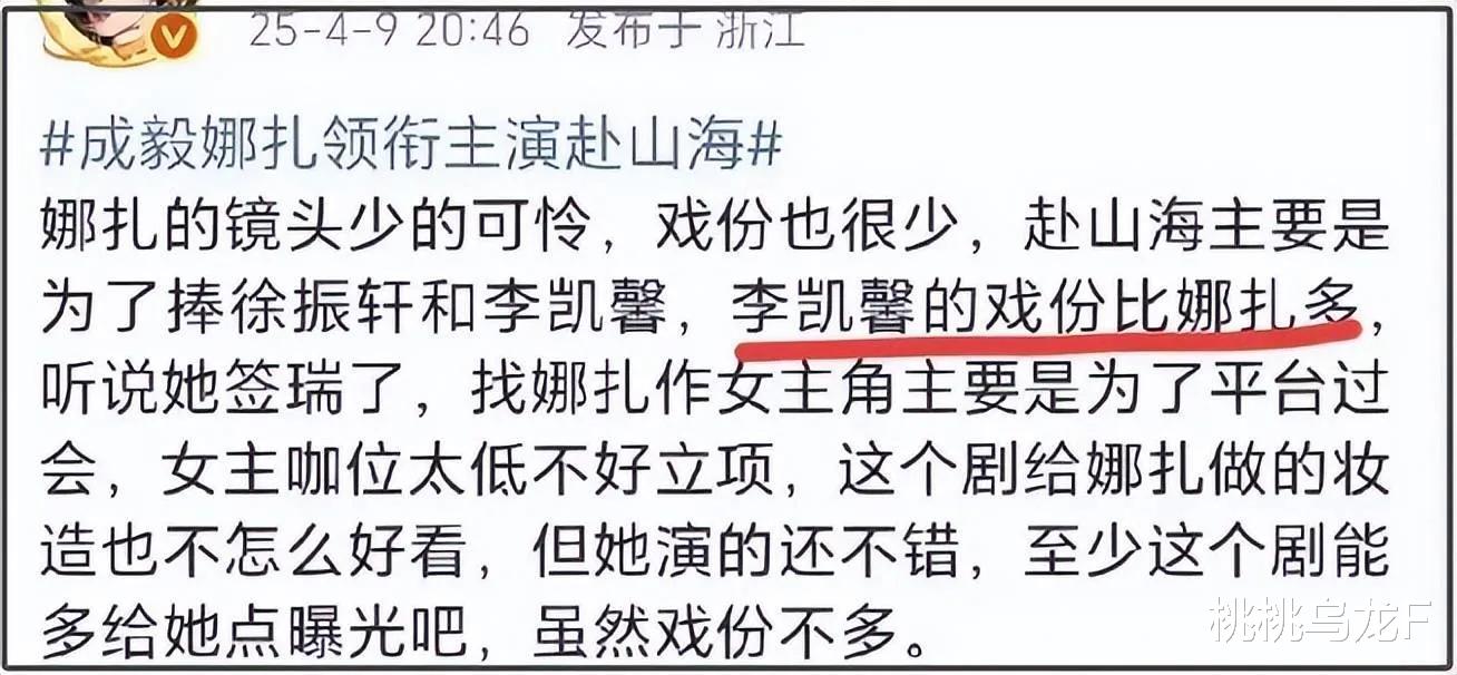 最戏剧化的是,《赴山海》剧组早在录音曝光前一天(4月9日)发布的预告片里,就把李凯馨的名字和镜头删得干干净净。原本她是女二号兼男主官配CP,戏份甚至比娜扎还多,但片花里只剩成毅的大男主剪辑,连娜扎都成了背景板。