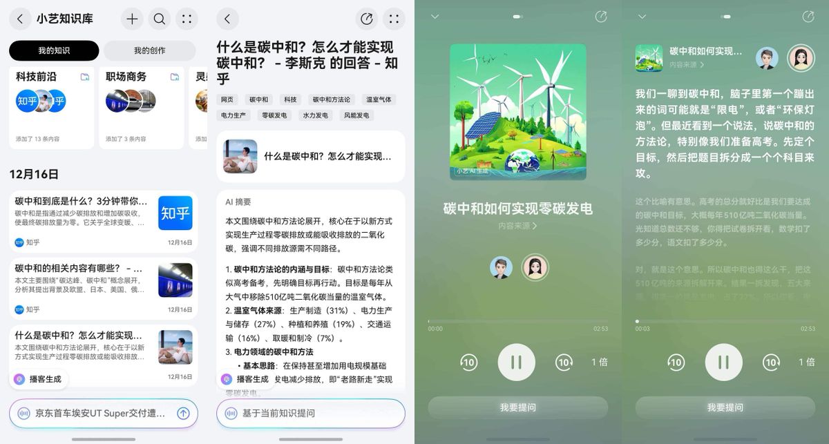 同样实用的功能还有小艺知识库。我把读过的文献、摘录的笔记都存进小艺知识库,TA不仅能自动分类整理,还能把知识生成互动式AI播客。在食堂排队或去教室的路上,可以听一段近期的“学术动态”,原本卡住的思路,在边听边问边学的过程中,也许会找到新的灵感。