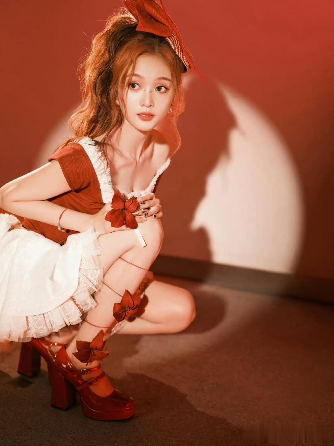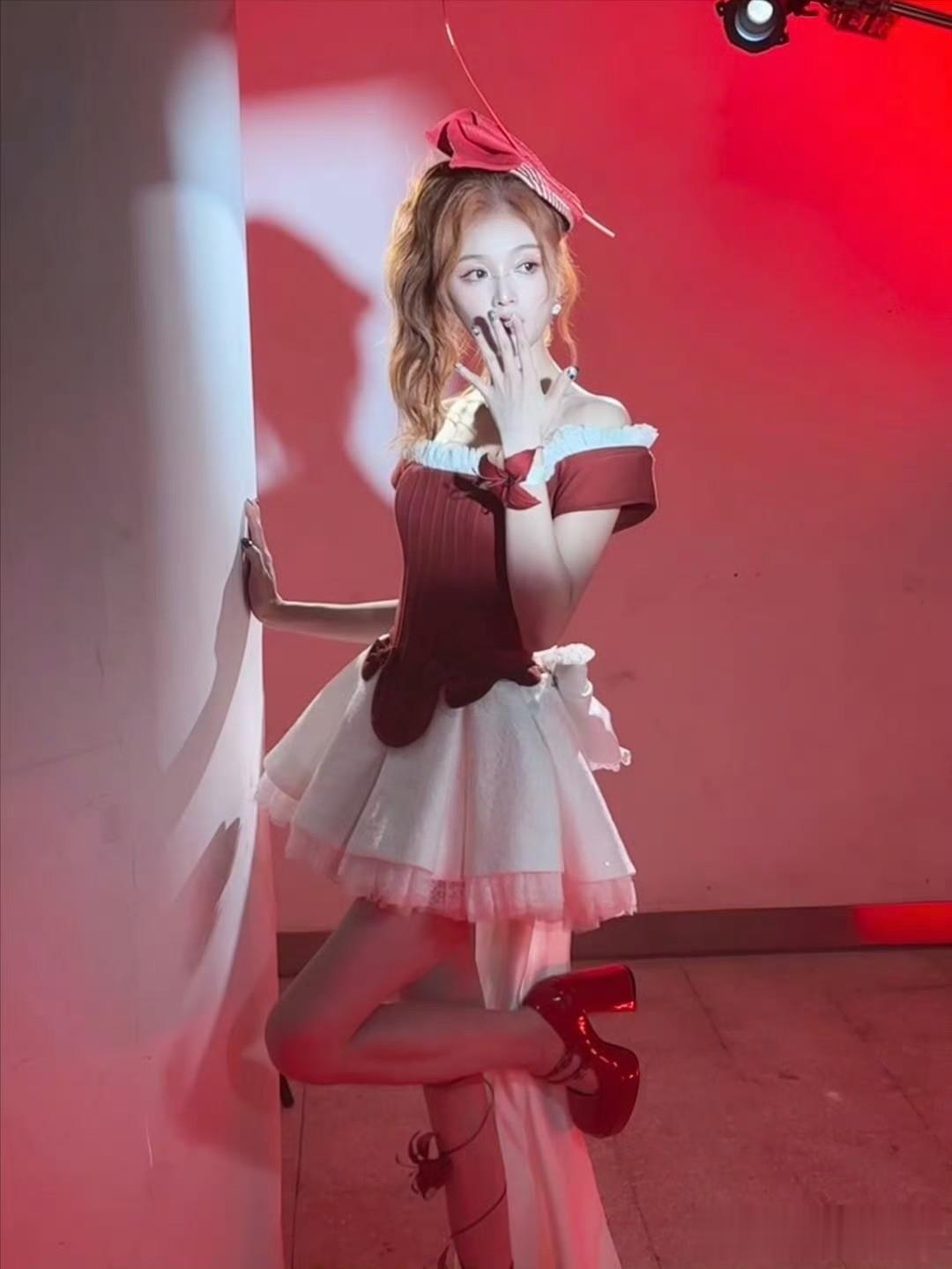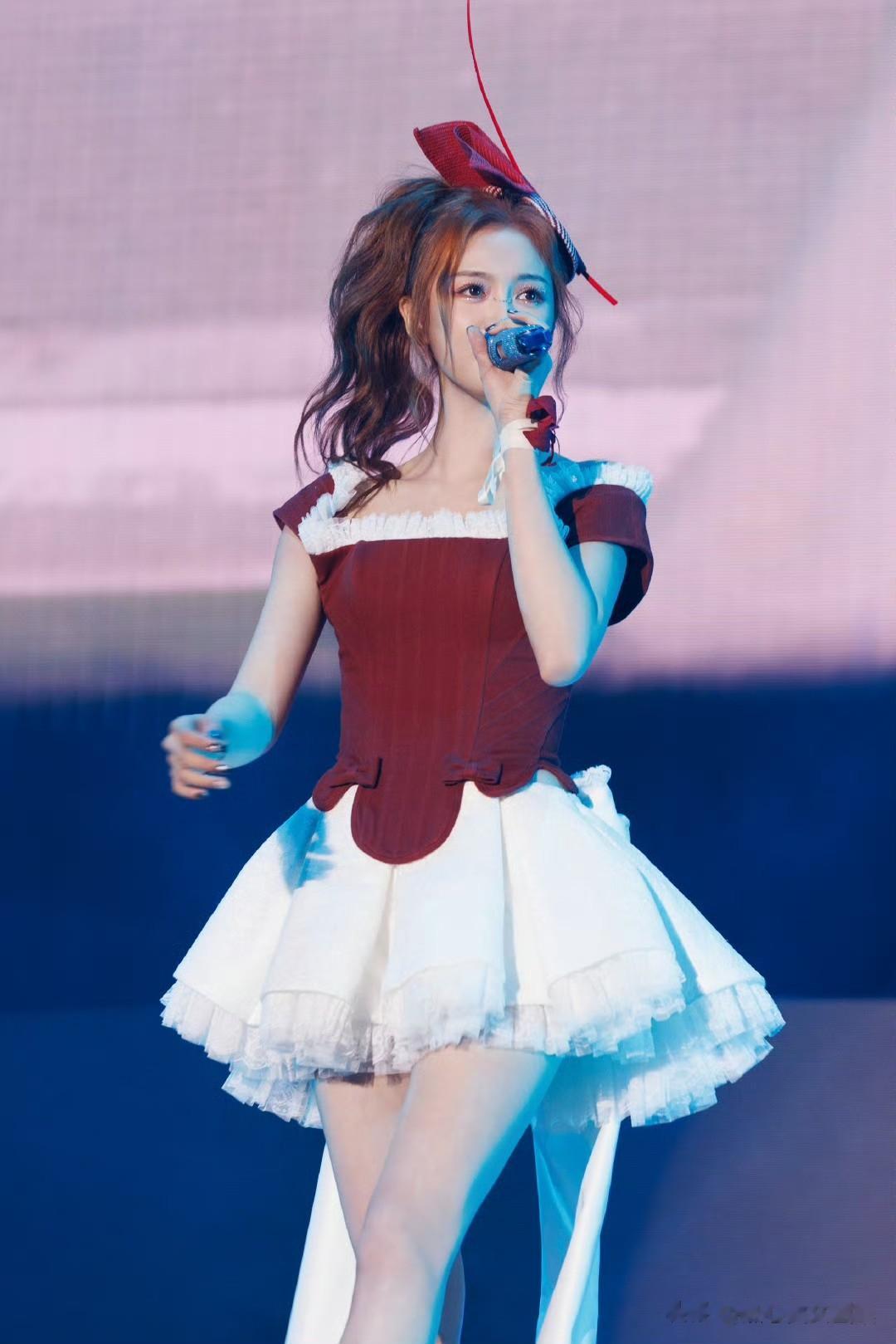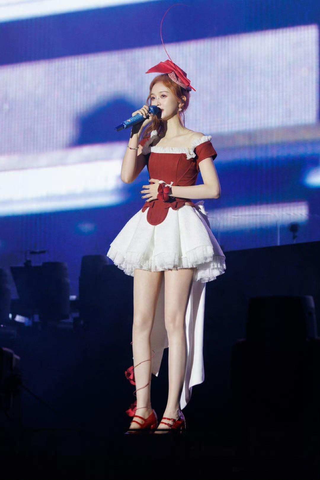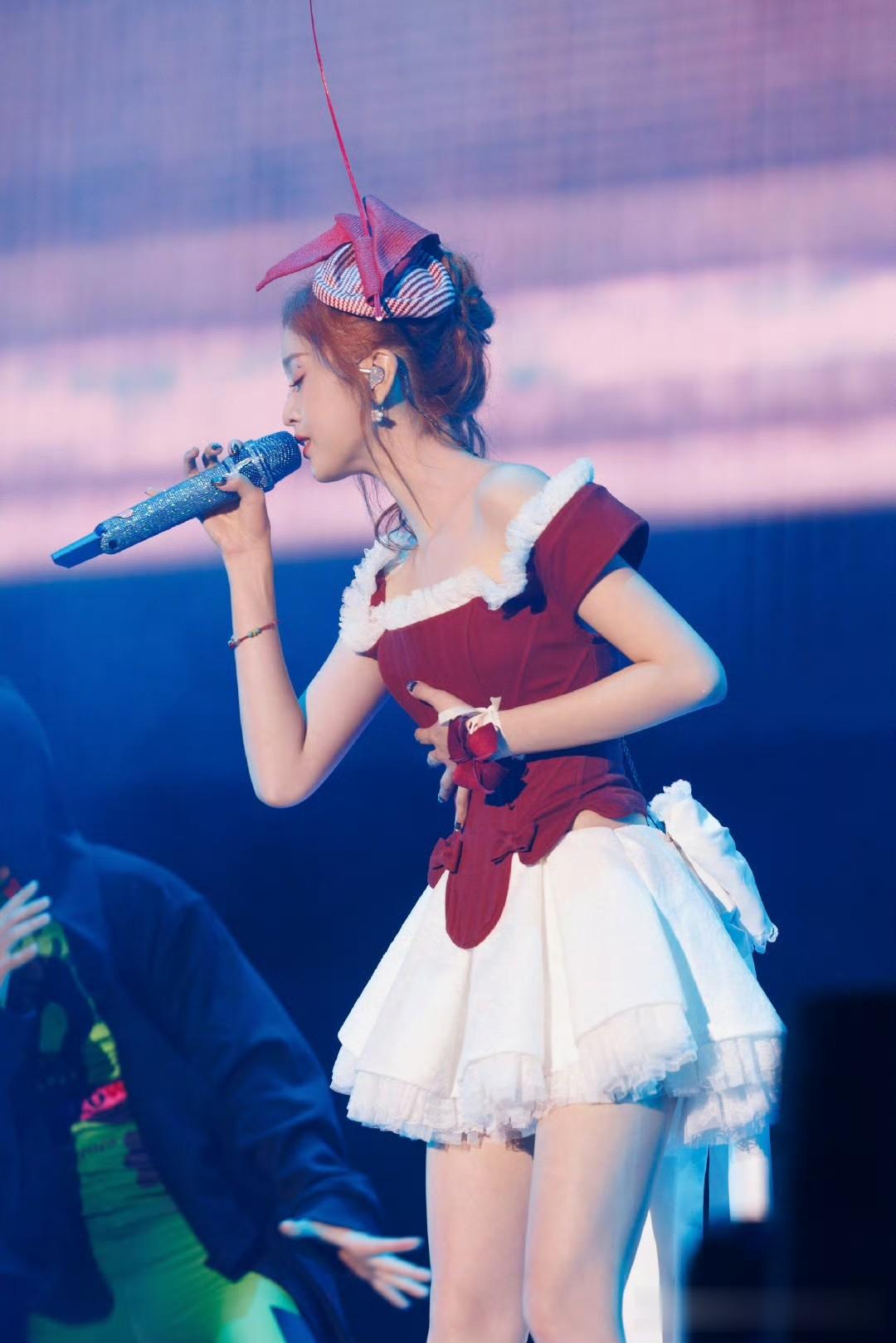 吴宣仪在红白色彩交织的舞台上,宛如“蝴蝶少女”般散发着独特魅力。就像她身着IVANYONGCOUTURE蝴蝶礼服现身时,仿佛演绎着冰雪仙境。冰蓝色裙摆在灯光下拖出细长光带,胸前和肩背的立体蝴蝶似会拍动翅膀。