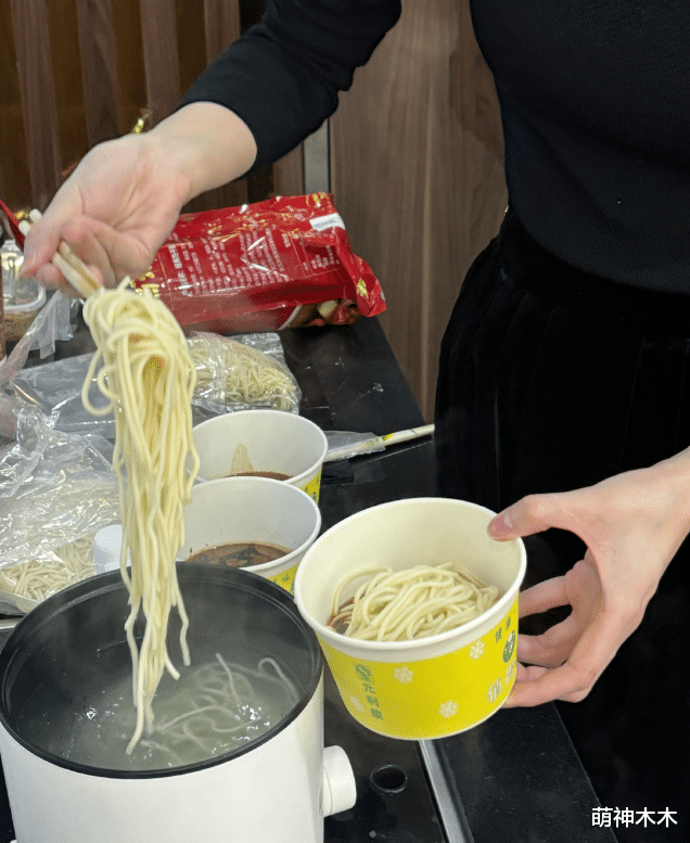 速食包装、小电锅,这就是在外打工人的标配吧,就连碗都是一次性的纸盒。不过王玉雯吃着也很开心,还透露晚上也会吃饺子,过年标配不能少!