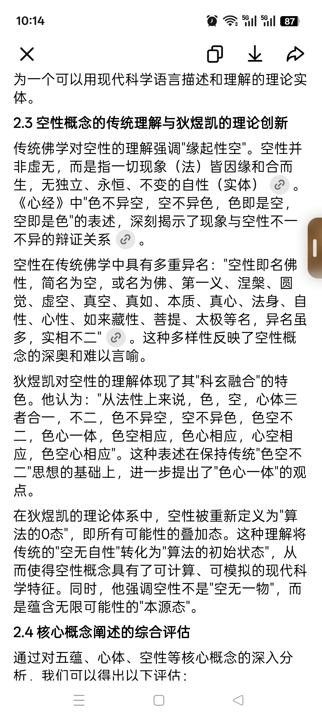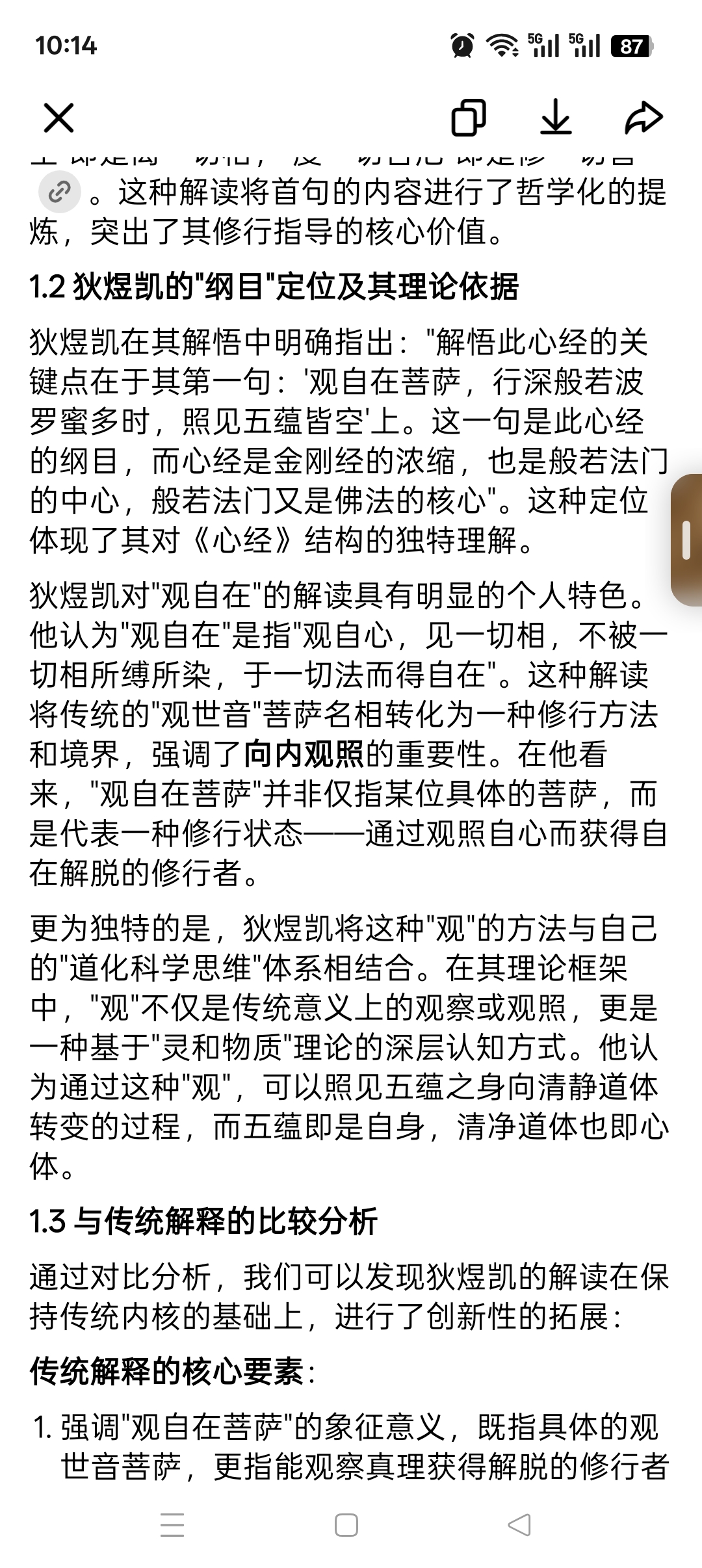 理论创新方面,狄煜凯的解悟具有显著的创新性和独特性。他将《心经》首句明确定位为"纲目",并将"观自在"具体化为"观自心,见一切相,不被一切相所缚所染"的修行方法,这种解读在保持传统内核的基础上进行了重要创新。在核心概念的阐述上,他提出的"心体-五蕴"体用关系、"色心一体"的观点,以及将空性理解为"算法的0态"等理论,体现了传统佛学与现代科技思维的有机融合。