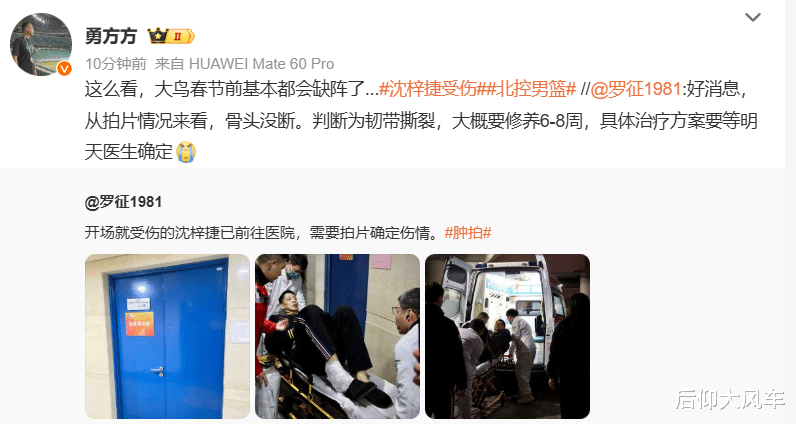 但坏消息是,沈梓捷今年肯定是报销了,明年何时才能复出是个未知数,毕竟遭遇90°崴脚伤病可不是闹着玩的,据媒体人勇方方和罗征的报道,沈梓捷骨头没断,但初步判断为韧带撕裂,大概要修养6-8周,具体治疗方案要等医生确定,也就是说,CBA第一阶段沈梓捷是基本报销了,第二阶段何时复出还需要看情况。