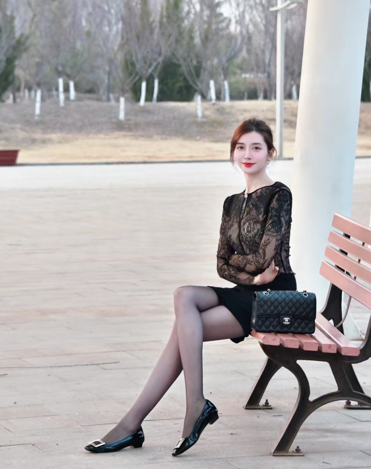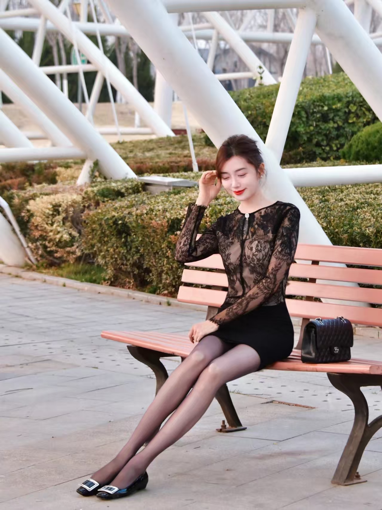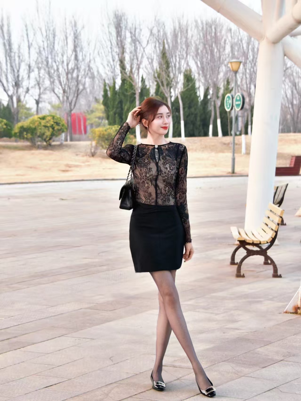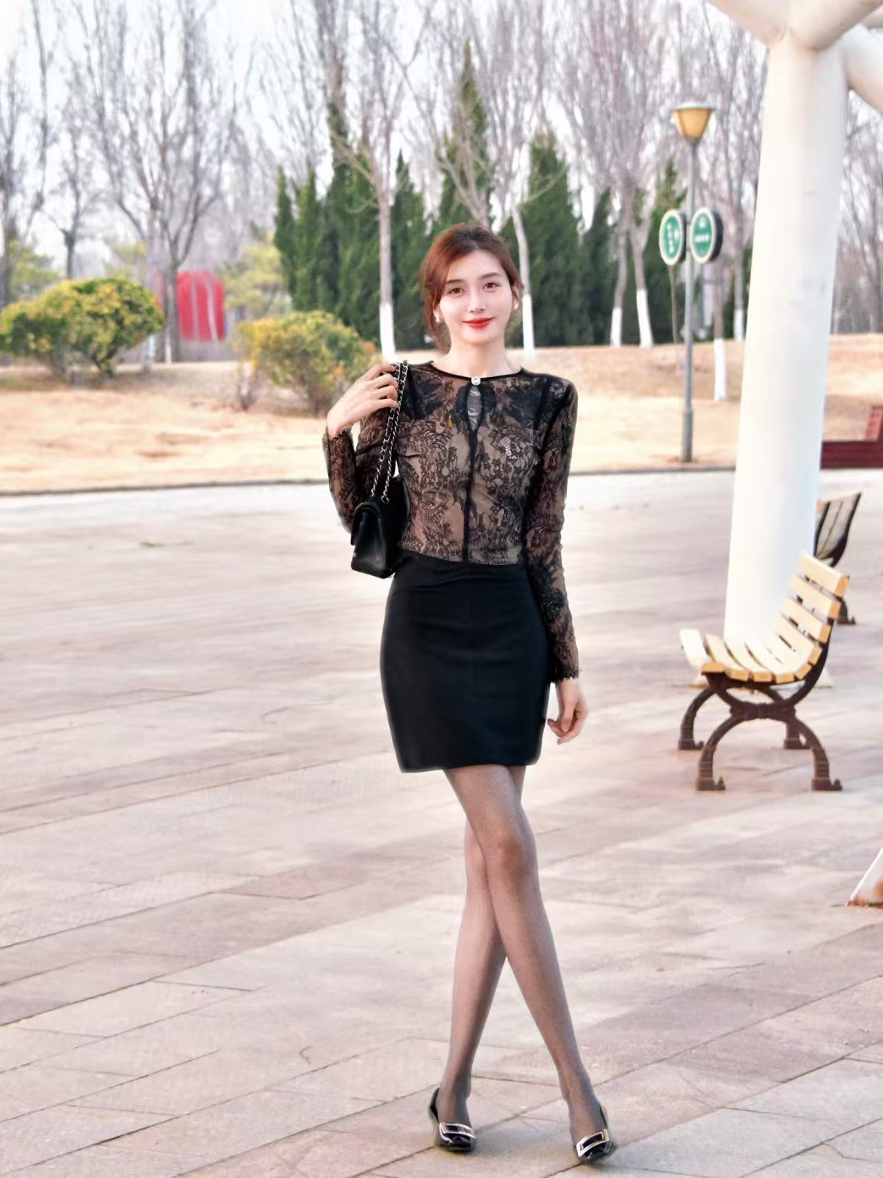 当一个女性身着黑色蕾丝长袖上衣与黑色包臀短裙,脚踩黑色高跟鞋,腿穿肉色丝袜,手提黑色链条包走在都市的街头时,她就像是一位行走的时尚标杆。她的每一个眼神,每一个动作,都散发着独特的魅力。她可以走进一家高级餐厅,在柔和的灯光下,享受美食的同时,成为餐厅里一道亮丽的风景线;她也可以走进一家时尚的酒吧,在动感的音乐中,释放自己的热情,成为舞池中的焦点。