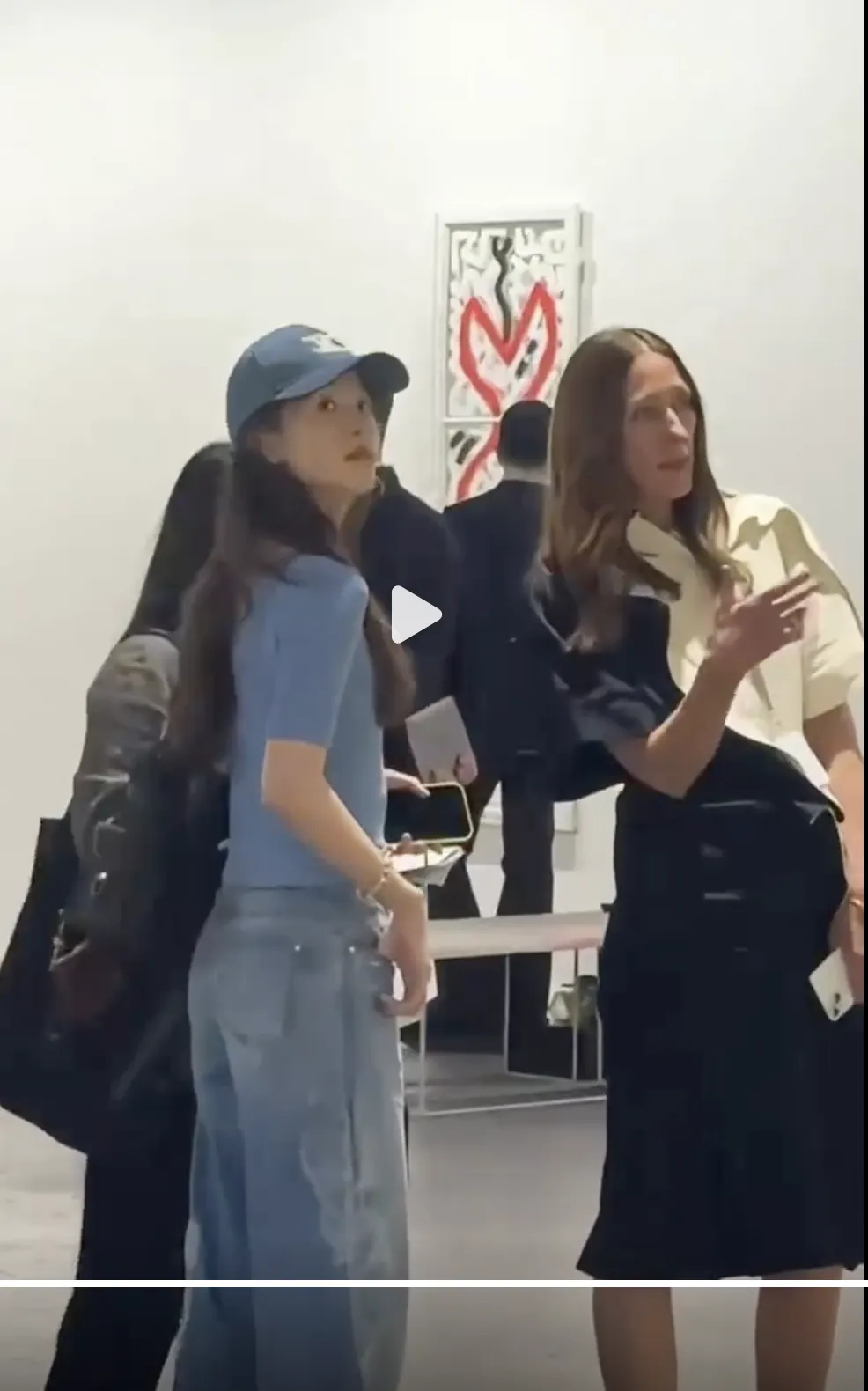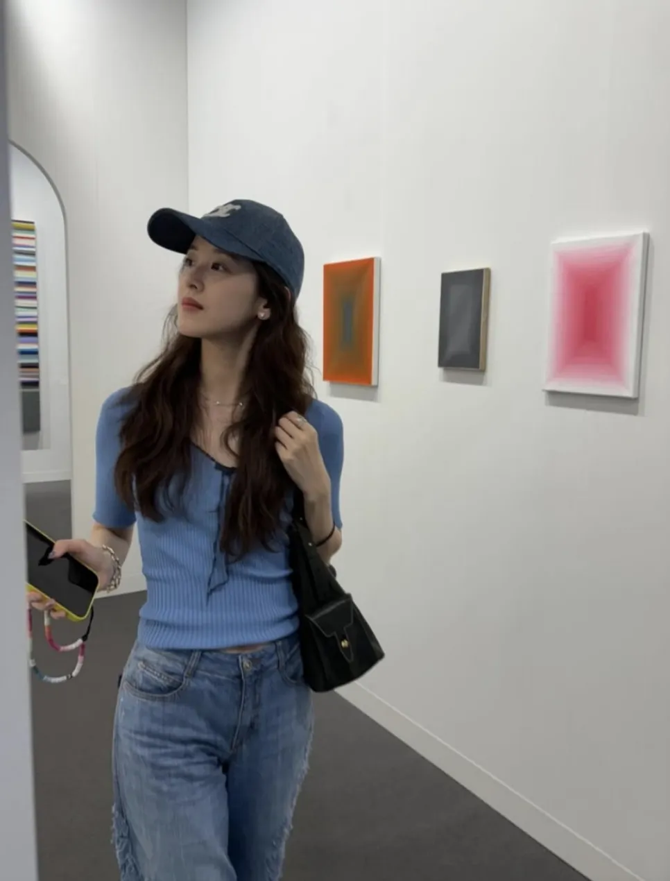 章泽天穿着一件天蓝色的针织毛衣,下身是一条同颜色的牛仔裤,还戴着鸭舌帽,走在艺术展中相当青春有活力。