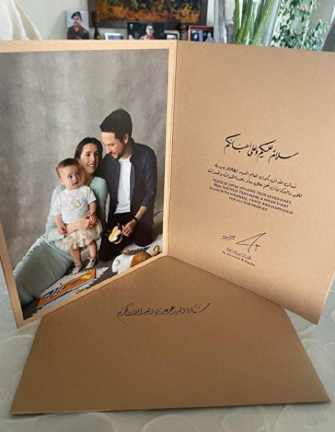侯赛因王储家的新年贺卡款式设计简洁大方,和其他家不一样,采用的是复古的黄色牛皮纸,封面只有简单的一行字,内页一面是约旦王储一家三口的照片,另一面则是王储夫妇的新年寄语和签字落款。虽然简单,却更显大方和复古的典雅。